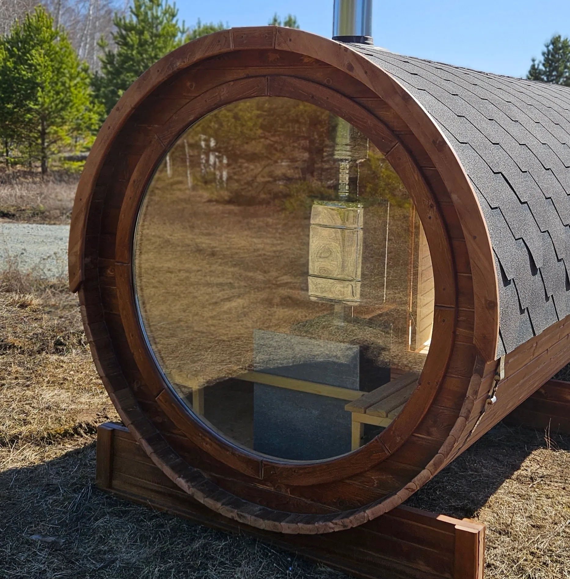 Это изделие круглой вытянутой формы. Козырек не только украшает баню, но и защищает оставленную обувь от дождя. Лавочки из кедра находятся по всей длине бани-бочки с обеих сторон. Печь расположена в парилке около дальней стены. Время растопки такой печи не превышает 30 минут. В зависимости от выбранного размера круглая баня-бочка с козырьком имеет следующую комплектацию: