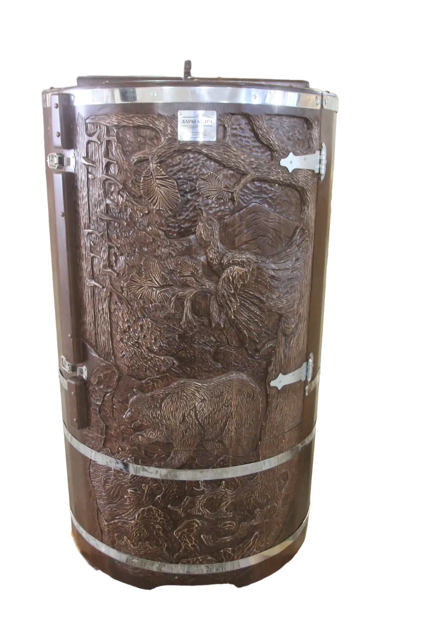 Резьба на дверце кедровой бочки