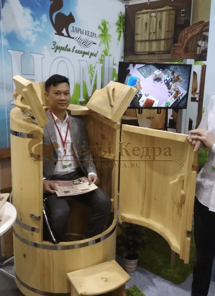 Бондарная фитобочка имеет такое название, потому что выполнена по старинной технологии в шип-паз, без использования каких-либо иных дополнительных скрепляющих элементов. Производственное оборудования позволило для круглых бочек применить лунный паз глубиной 2.5 см, который имеет надежное прилегание досок друг к другу, скрепляя бочку плотно, не пропуская пар и имеет вид фаски. Кедровая Фитобочка - это мини парная, которую можно установить в квартире и каждый день использовать в домашних условиях. Настоящая лечебница для здоровья всей семьи. Во время парения человек сидит внутри кедровой бочки, а голова находится снаружи. Благодаря этому исключается перегрев и процедура парения комфортно переносится пожилыми людьми и детьми.