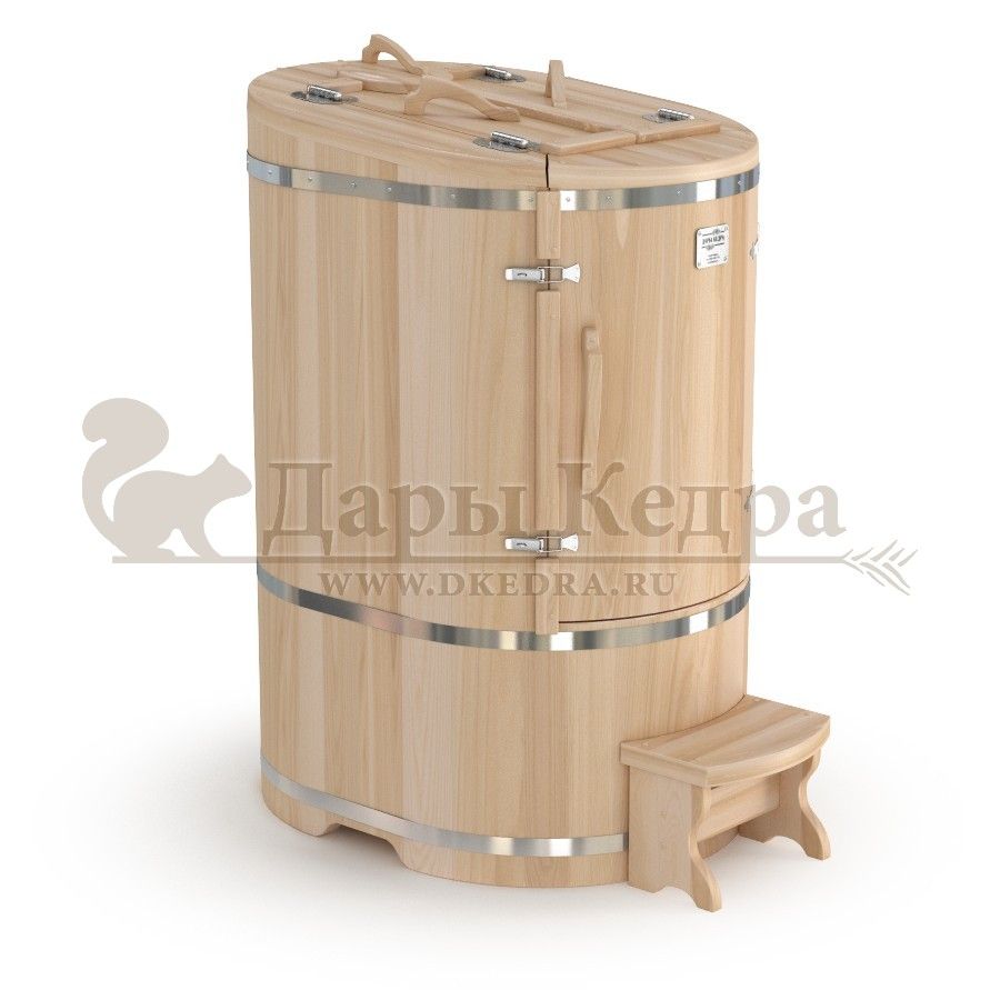 Кедровая бочка (фитобочка) овальная со встроенным парогенератором «Профессиональная» Овальная форма этой кедровой бочки позволяет комфортно разместится даже высоким людям. Встроенный парогенератор исключает дополнительный монтаж. Ширина 78 мм позволяет занести бочку в помещение со стандартным проёмом в собранном виде. Толщина стенок 45 мм позволяет увеличить срок службы изделия. Подходит для коммерческого использования.
