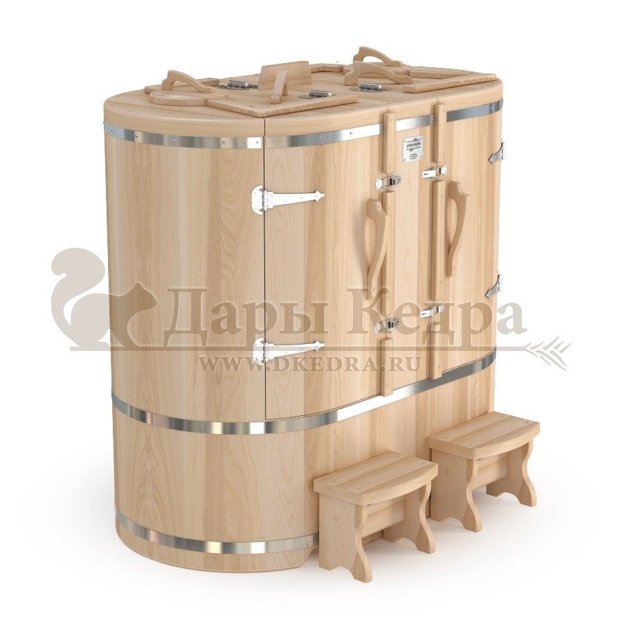 Кедровая бочка (фитобочка) двухместная «Профессиональная» Двухместная фитобочка из кедра - это парная, в которой удобно принимать процедуры двум людям. Она оборудована откидными створками, дверцей, отверстием для головы и перегородкой (по желанию). Толщина стенок составляет 40-45 мм, что позволяет увеличить срок службы изделия. Во время парения человек находится внутри кедровой бочки, а голова снаружи. Благодаря этому исключается возможность перегрева. Подлокотники из кедра и внутренние ручки делают эксплуатацию фитобочки более удобной. Парение в фитобочке благотворно влияет на организм в целом: повышается иммунитет, выводятся шлаки и токсины, улучшается работа органов тела и состояния кожи.